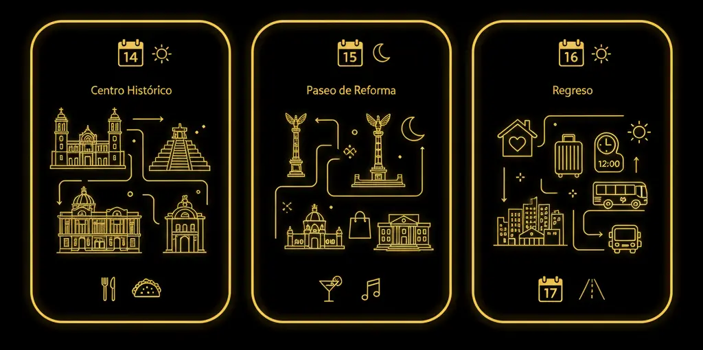 | 7. ¿Qué haremos en los 3 días de viaje? | Tendrás libertad total para explorar el Centro Histórico y el Paseo de la Reforma. Te damos una lista con más de 15 opciones. |